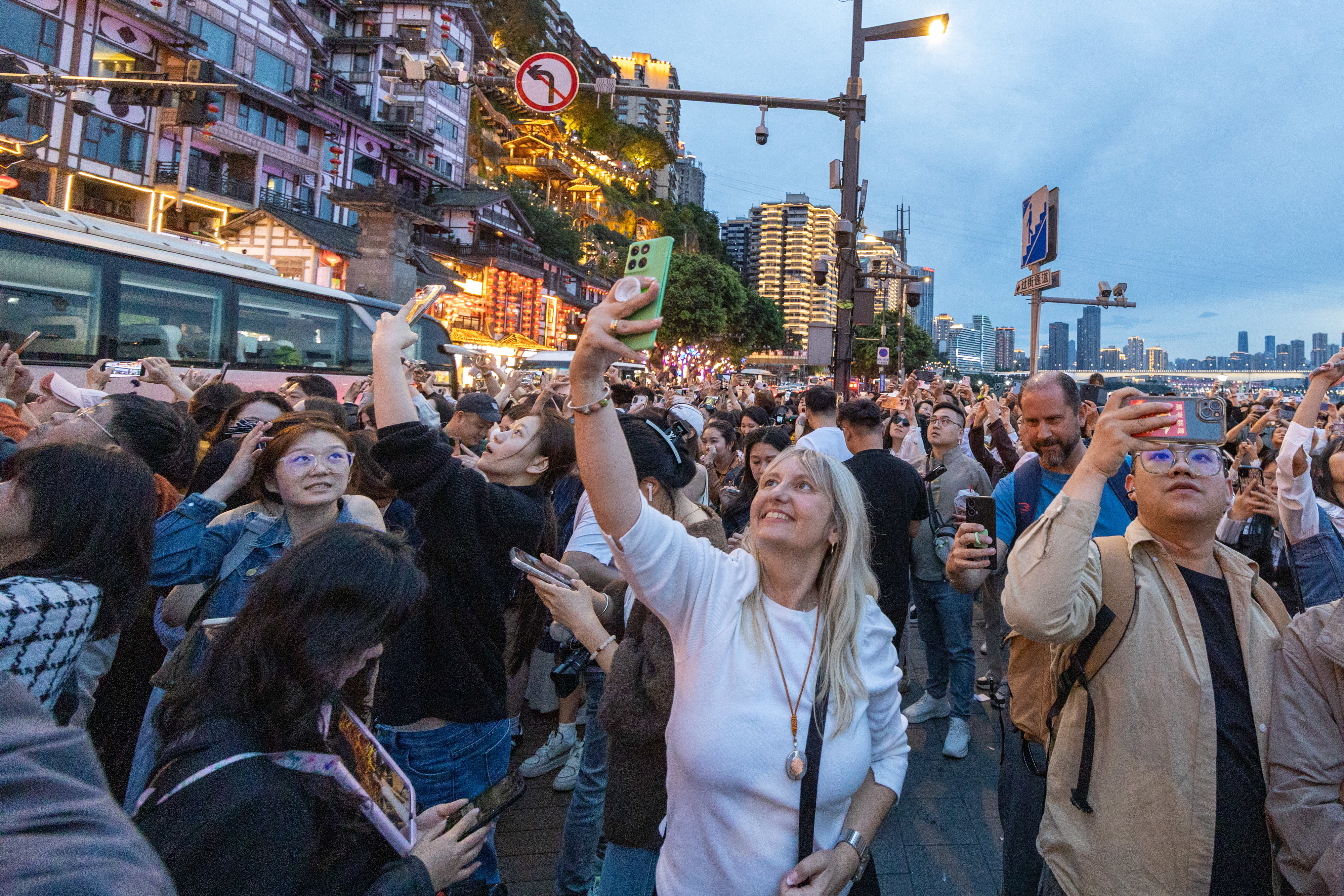 4月22日,外籍游客在重庆市渝中区拍摄洪崖洞景区亮灯后的景观。新华社记者 黄伟 摄