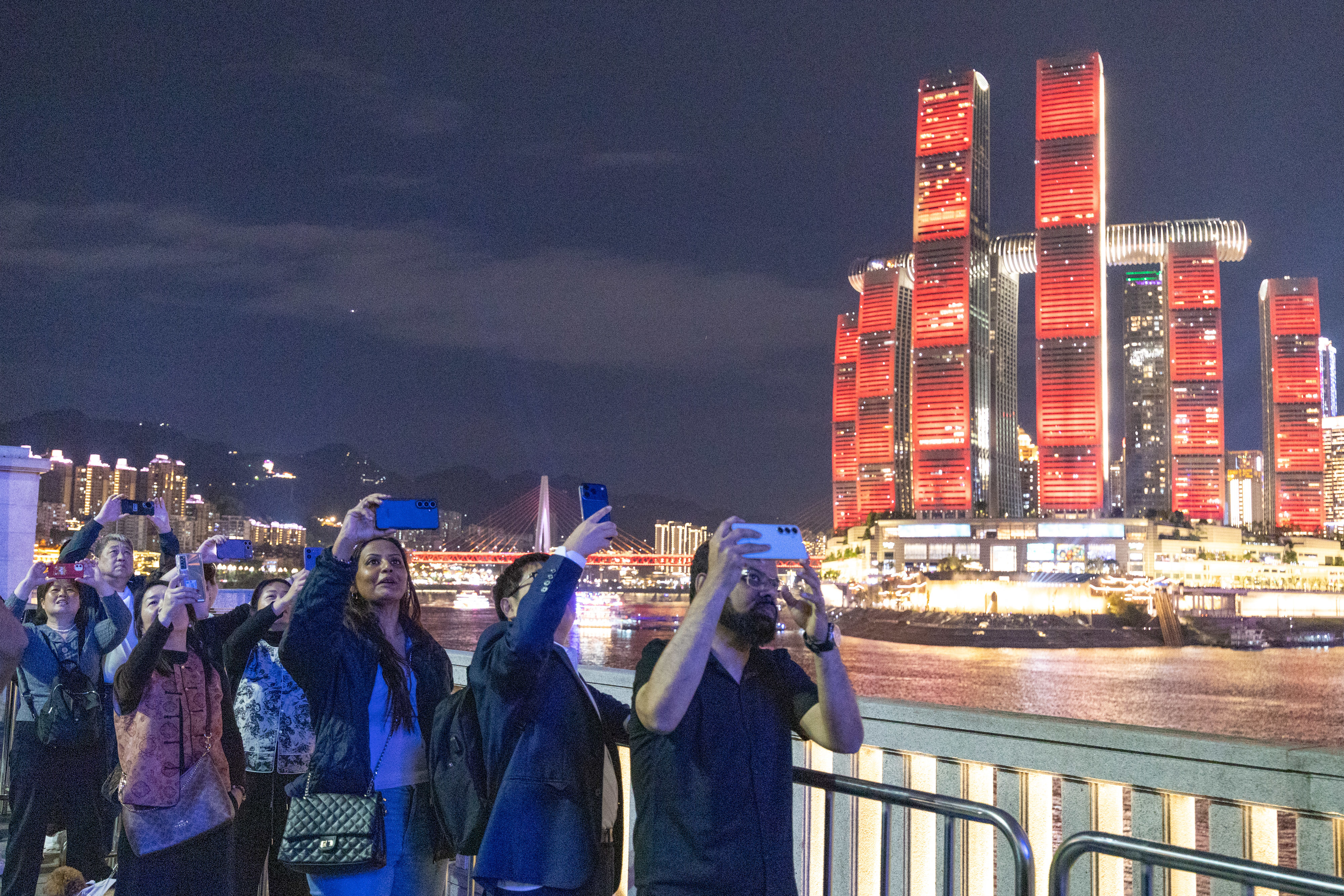 4月22日,外籍游客在重庆市南岸区南滨路拍摄无人机灯光秀表演。新华社记者 黄伟 摄