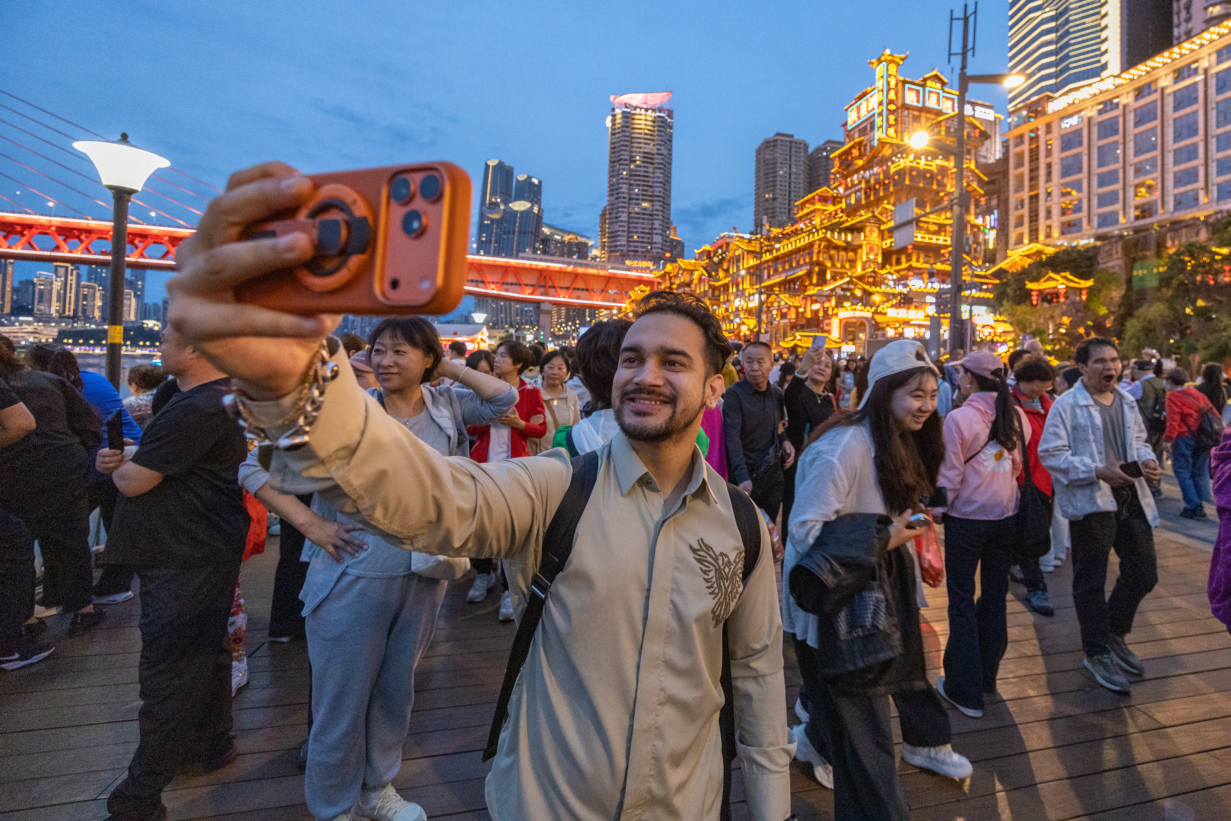 4月22日,一名印度游客在重庆市渝中区洪崖洞景区前自拍。新华社记者 黄伟 摄