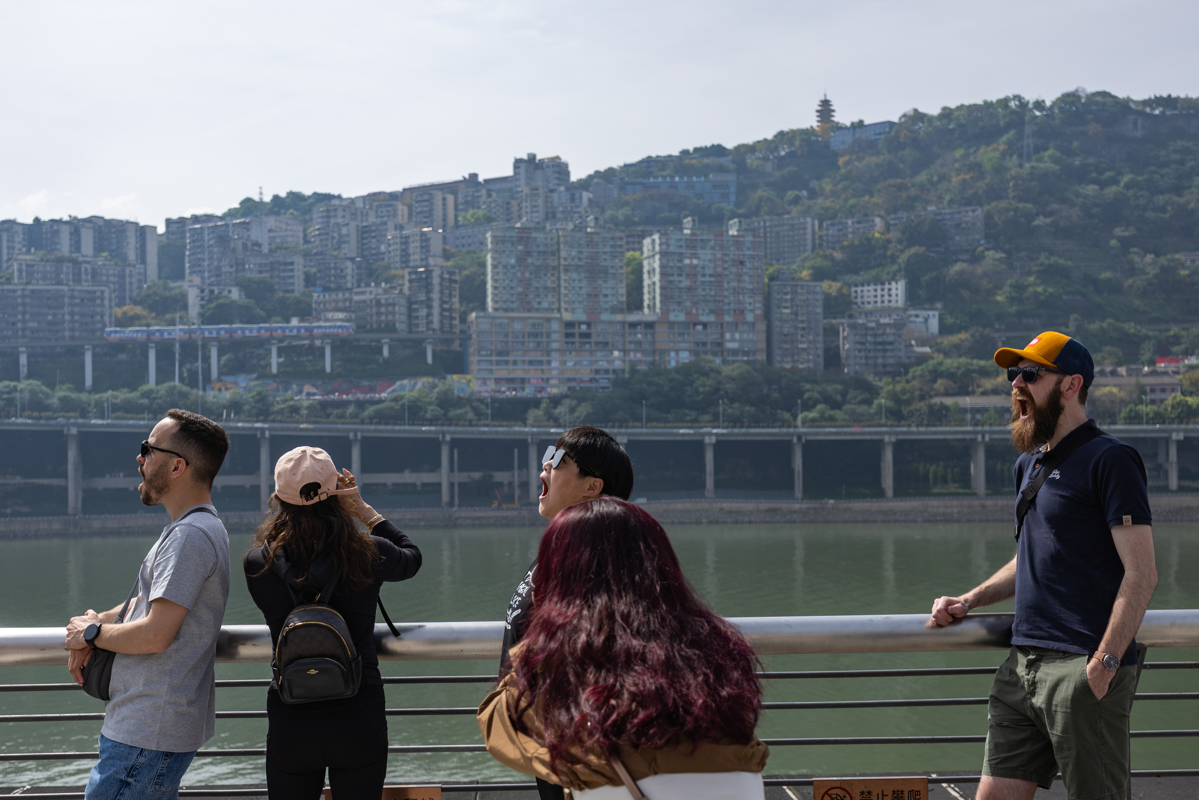 4月23日,在重庆市两江新区,外籍游客摆出“吃”轻轨的姿势拍照。新华社记者 黄伟 摄