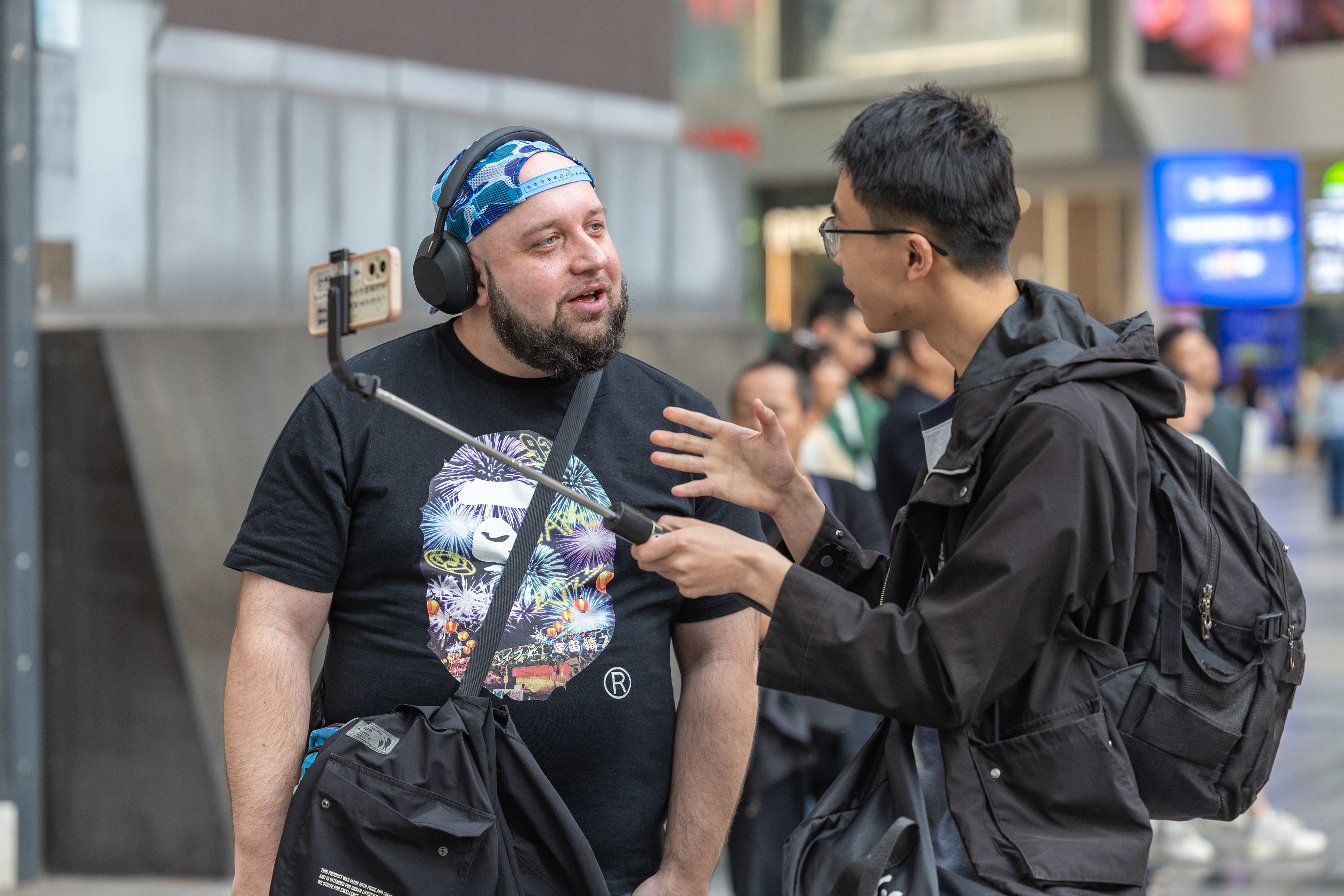 4月22日,在重庆市渝中区解放碑商圈,一名荷兰游客(左)和一名中国博主交流。新华社记者 黄伟 摄