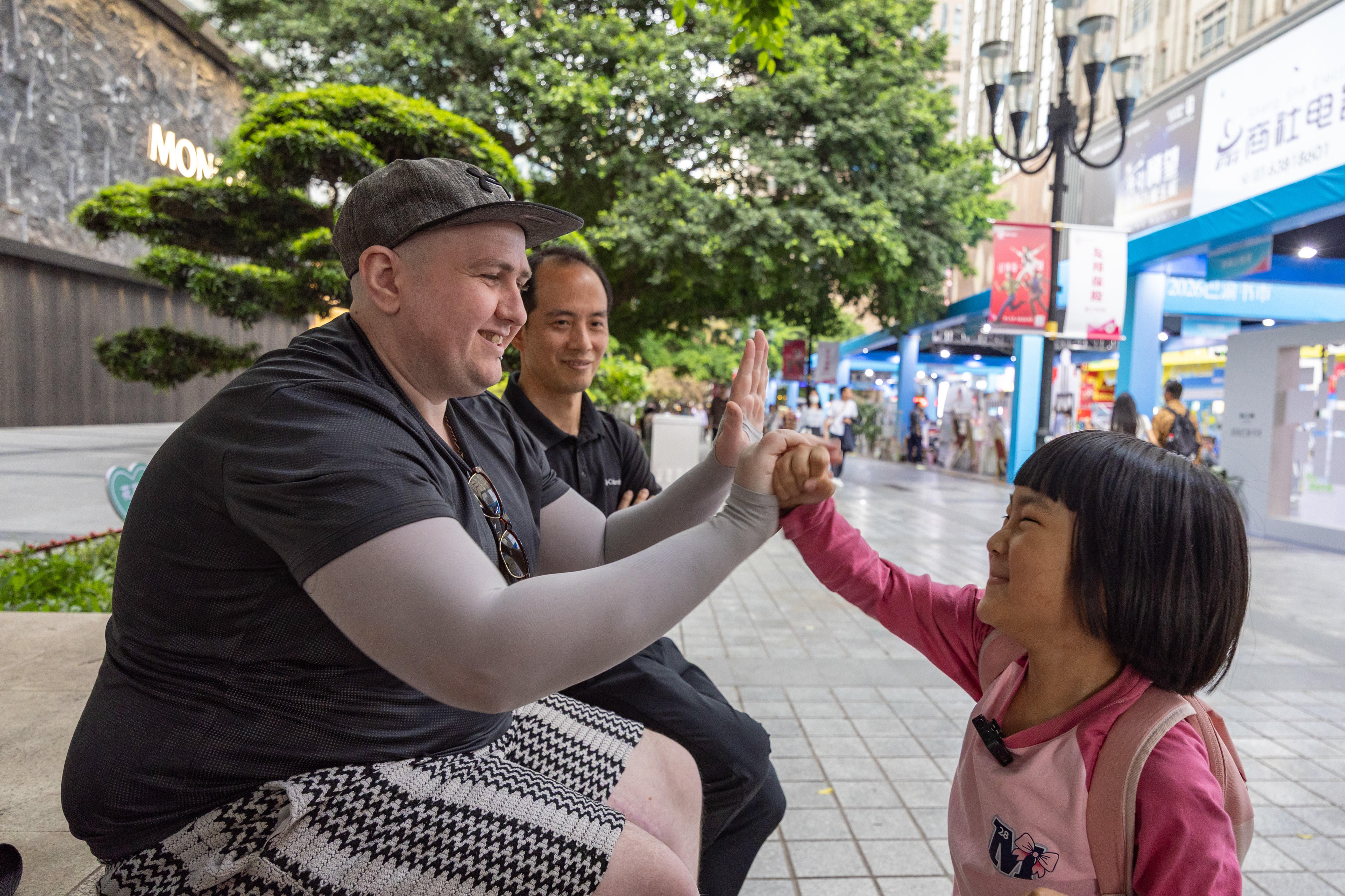 4月22日,在重庆市渝中区解放碑商圈,一名中国小女孩和来自爱尔兰的游客互动。新华社记者 黄伟 摄