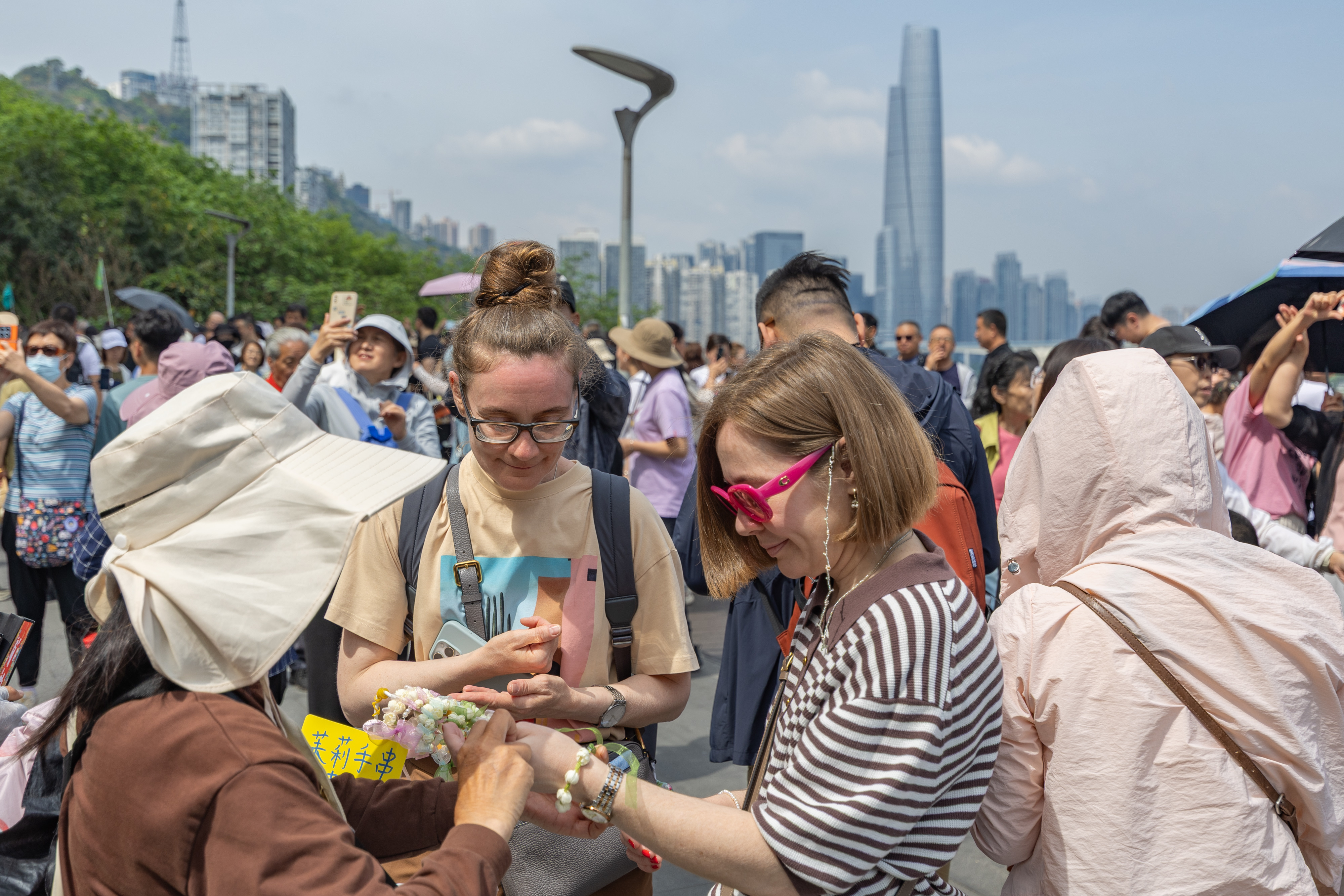 4月23日,在重庆市渝中区李子坝观景平台,外籍游客购买茉莉花手串。新华社记者 黄伟 摄