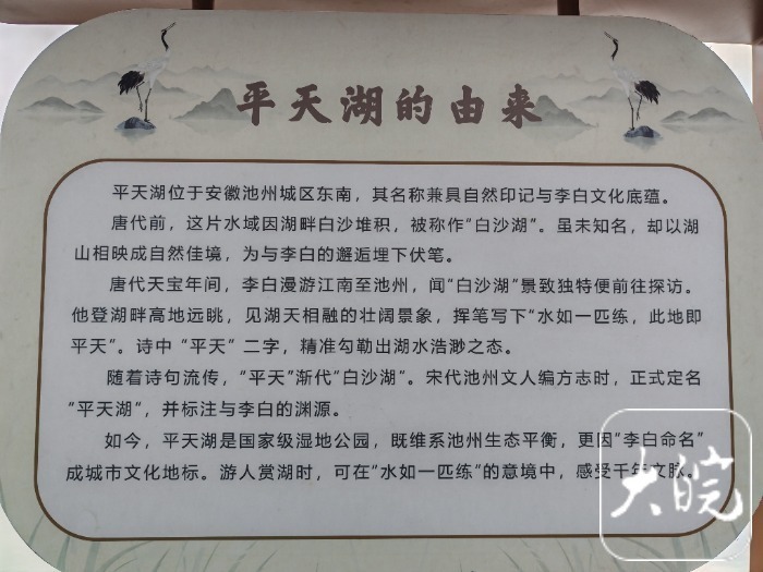 平天湖集山、水、湿地于一体,以“水如一匹练,此地即平天”的优美诗句而得名,因唐代大诗人李白曾在此夜游并留下千古绝唱而闻名于世。